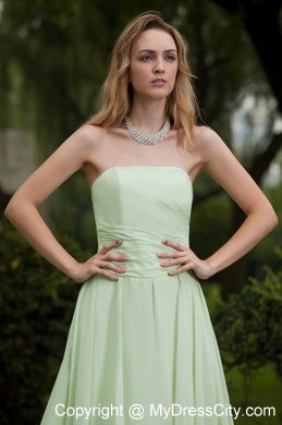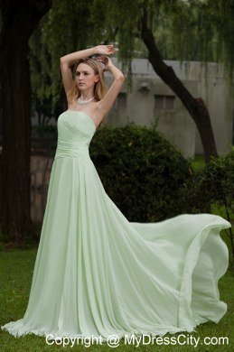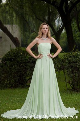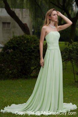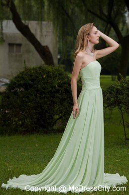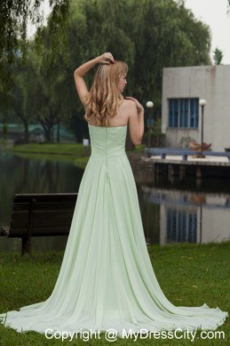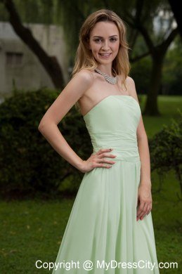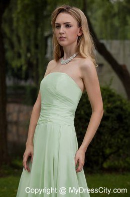 Simply gorgeous this aplle green prom this is!Fitted,strapless bodice features ruched decoration and a ruffled skirt flows freely to the floor to conture your slim figure.A zipper up back with a sweep train this wonderful design.