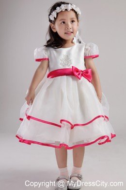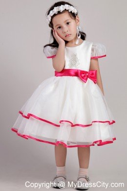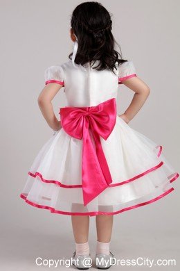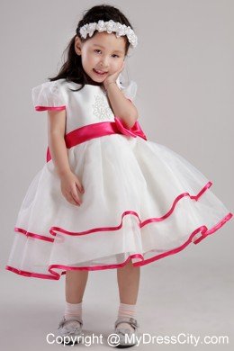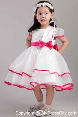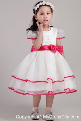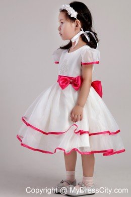 This cute and gorgeous organza flower girl dress features a tank bodice with scoop neckline and short sleeves.The hot pink sash with a lovely bow in front and also a big bow on the back.The hot pink edge and bows make the dress more eye-catching and dazzling. The skirt is classically beautiful, with a full and tea-length style. Zipper up back.