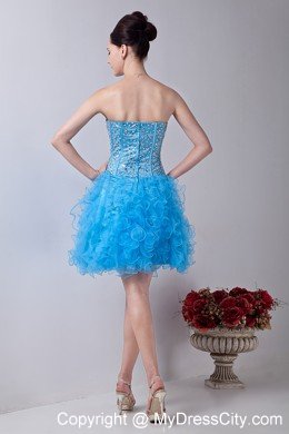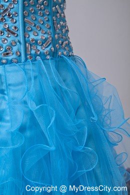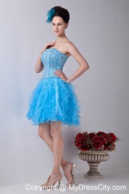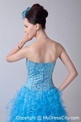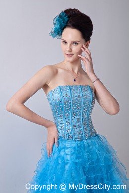 This gown features strapless with straight neckline that is encrusted with crystals on the front and back with zipper uo back. The short skirt has lovely ruffles. A bit retro and a lot gorgeous! You will be a focus in the pretty turquoise dress.