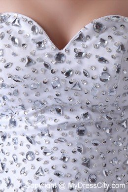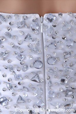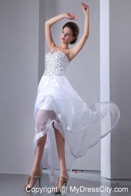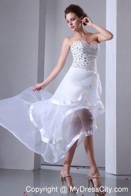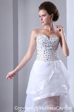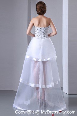 Three words come to mind to describe this dress: fun, flirty and fabulous. It's made from a fancy chiffon material and features a strapless bodice. Beading and rhinestones create a stunning look. The underskirt is a mini-style while the top skirt is layers of tulle with asymmetrical hem, making it longer in the back. A thin tulle shows you slim leg faintly and creates a flirty look. A hidden zip closure at the back completes the look.
