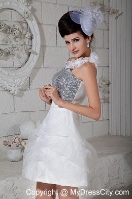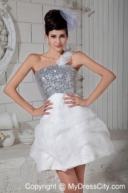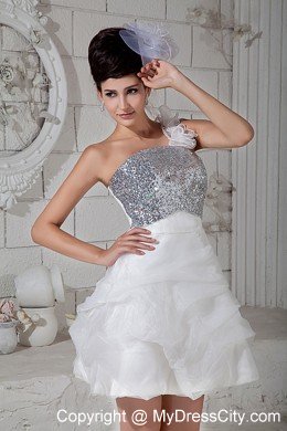 Elegent and romantic!The bodice accented by the sequins throughout flatters most figures.The froral embellishments feature the one strap.It truly is an example of high end couture fashion.The layered mini-skirt adds the charm. The hidden zipper in the back of the dress secures it in place and makes for easy off and on.You are sure to be charming and fabulous at your very special day.
