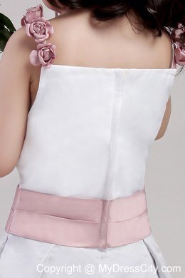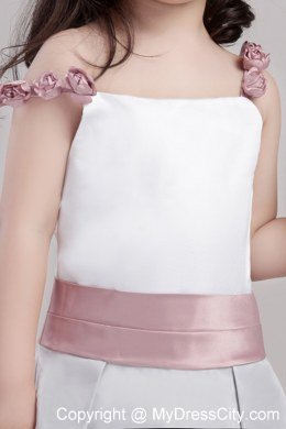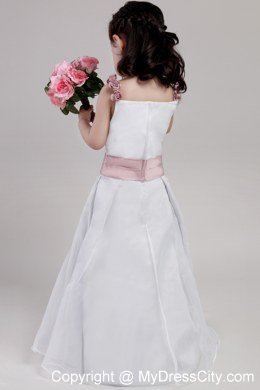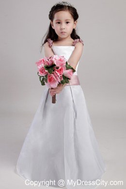 All eyes will be on the flower girl as she makes her way down the aisle in this white ball gown little girl dress. The spaghetti straps are accented with lovely flowers. A brightly colored belt with glittering accents encircles the waist.The skirt extend into the floor making the dress charming.