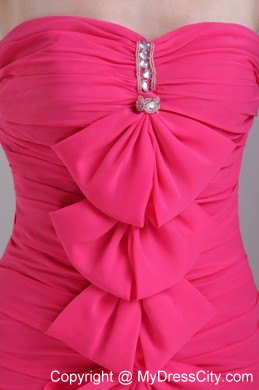 Peach strapless prom dress.Beadwork is embellished in the middle of the bust. Ruched whole dress makes you feel alive! Breezing and attractive, the tempting dress with neatly arranged bows start from empire waist to hem make the dress a focal point in a room.The terrific short column silhouette set your legs free. The dress shines the charming of sexy.