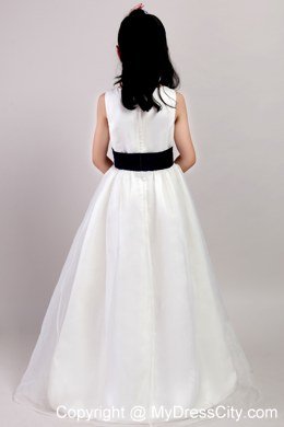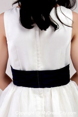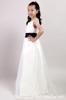 This dress is sleeveless with two wide straps. Texture covers the top of the dress and a navy-blue like ribbon wraps the waist. The skirt is adorned with a tulle on outlayer shaped a perfect A-line look. This is ideal for a flower girl.