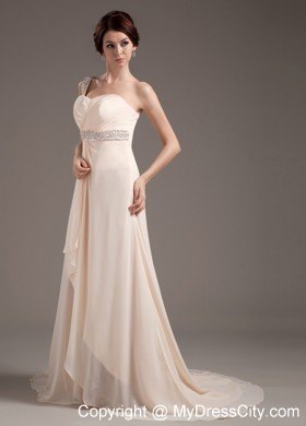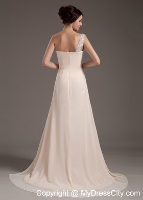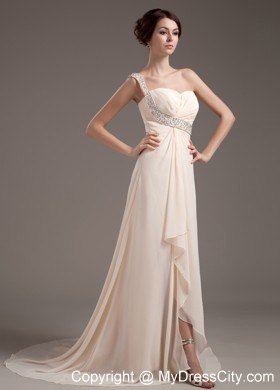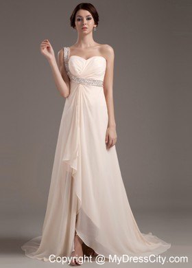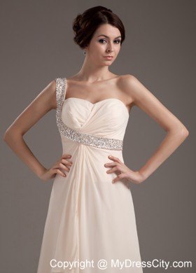 Bright and modern! This champagne prom dress will surely stunning on the crowd. It features a one-shoulder bodice with beading embellishments. A coordiinating waist adds beading details to creat the beautiful effect. The floor-length skirt is a long begins at the hips and envelopes the legs in soft chiffon all the way to the floor in clean lines. If you are looking for a charming dress with high quality, this is undoubtly the one you should consider.