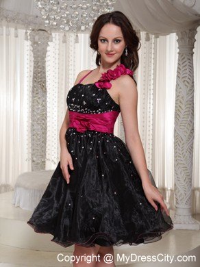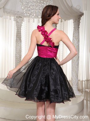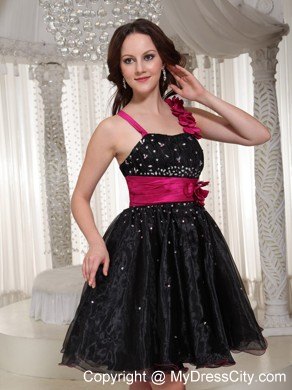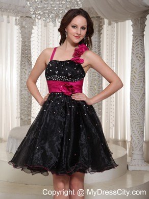 Take a walk on the wild side in this fabulous black short dress. The fitted bodice features a sweetheart neckline with two straps, one of which is embellished with hand made flowers. The asymmetrical ruching with shimmering beads accentuates your curve perfectly. The midsection is enruseted with a wide waistband adorned with an according flower that adds more interests. A chic and sassy short dress for your special occasion.