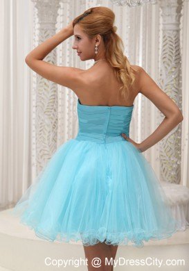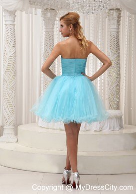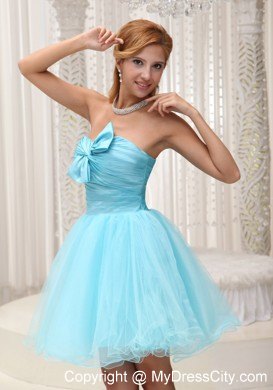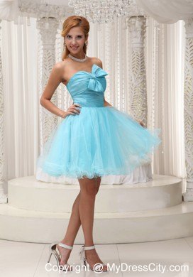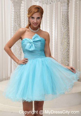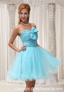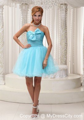 Make the most of your gorgeous legs with this aqua blue utterly ethereal cocktail strapless babydoll dress! Its pretty sweetheart bodice is accented with a lovely bowknot. A hidden zipper makes for easy off and on and secures the dress in place. Ethereal material floats around the skirt, adding extra enchantment and allure.