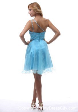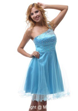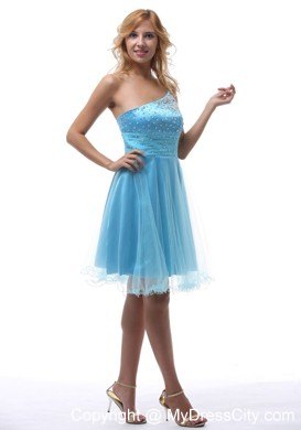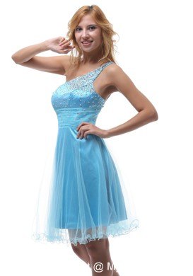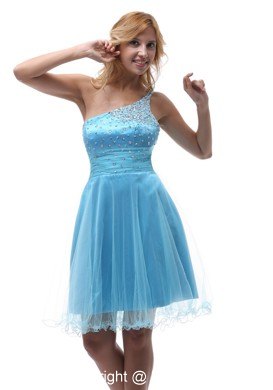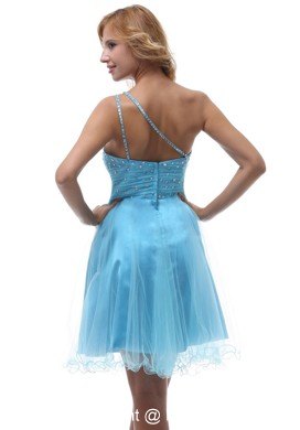 Realize your sweet dream with this stunning short dress! This wonderful aqua blue one shoulder dress is featured with glittering beading accents on the right bust, toghther with the ruched bust make the dress dazzlingly shaped. Half open back and the tulle skirt complete the look. The flowy chiffon continue the already chic dress more romantic. You are surely to be the hotest one in the party!