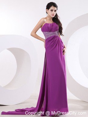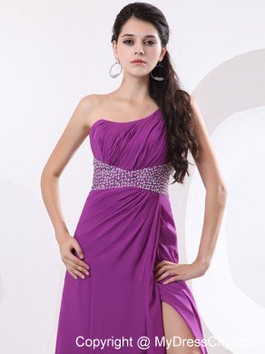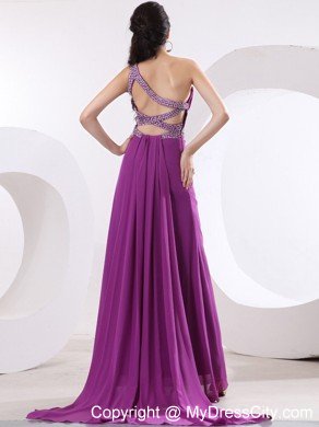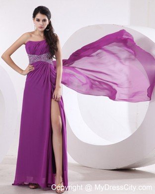 Elegant dresses with moderate designs often make a dramatic impression. This lovely dress is no exception. It features one shoulder strap bodice with exquisite ruched and beaded details.The dress with a watteau train sways beautifully across the floor when you move, as if you're floating on air. The high slit on the side will show off your sexy leg when you walk. Be elegant and sexy with this dress on!
