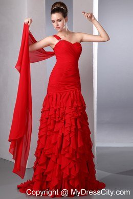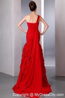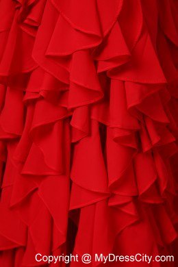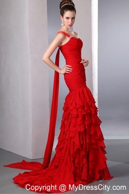 Hot, spicy, sexy and sultry are the words that come to mind when we see this dress. Made from chiffon material, it features a strapless bodice that has been heavily embellished with ruched design. It has a nice sweetheart neckline that is very flattering and a one shoulder wide strap linked by a small beading. At the other side of the shoulder strap a beautiful cape of fabric is attached and flows freely down the side, creating a stunning silhouette. The mermaid-style skirt is made from yards and yards of lightweight chiffon material that combine in a beautiful mess of ruffles. A gorgeous zipper closure in the back secures the dress in place and ensures a lovely fit.