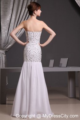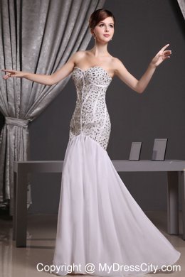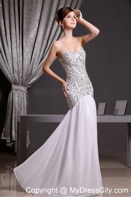 Stunning and dramatic! You are sure to be the belly of the party in this fabulous mermaid dress. This white chiffon sweetheart prom dress features the sweetheart bodice with overlaid beading on the whole bodice. The mermaid skirt sways freely when you move. A hidden zipper completes the look. This one puts you to mind of a traditional belle. Take the chance and bring it home!