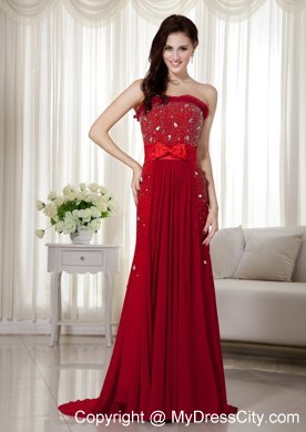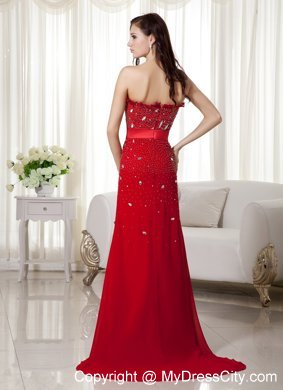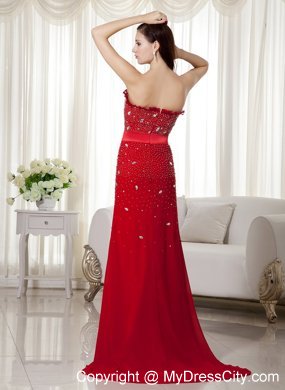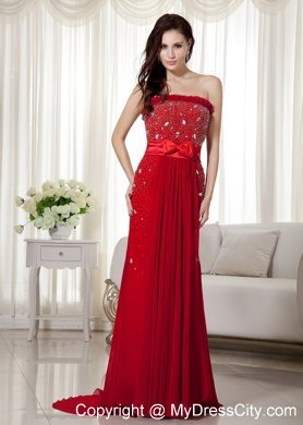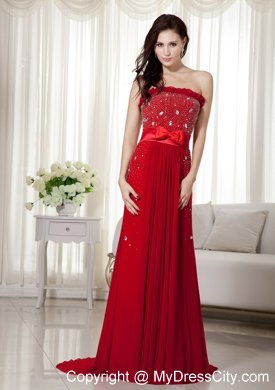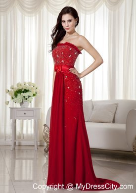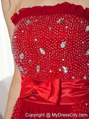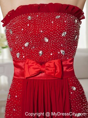 Flattering and elegent! A fitted, strapless bodice made of an all-over sequin and crystals. Couronne accenting the neckline. A bow embellished on the waist area, accenting the chic statement. The red dress is highlighted with the sweep train and the folds. The simple zipper up back finishes the look.