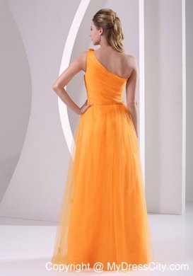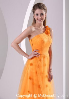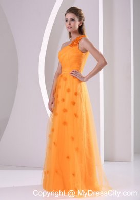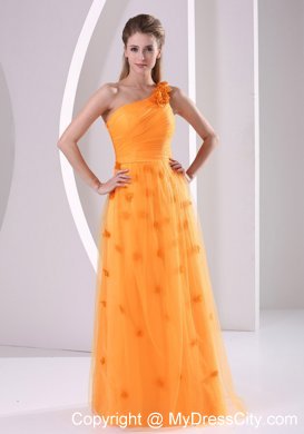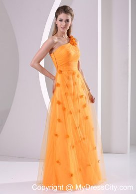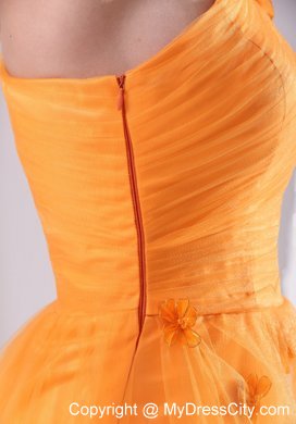 This luxurious orange evening gown will make you sparkle at prom. This stunning dress features a pleated bodice with a gorgeous one shoulder design which decorated by floral appliques. Under the tulle layer, the floor length skirt is with hand made flower throughout. A hidden zipper on the side makes the skirt easy off and on and secures the dress in place.