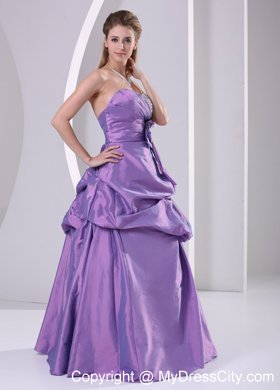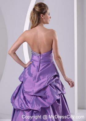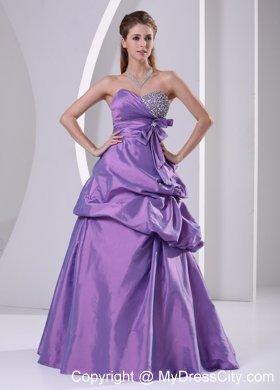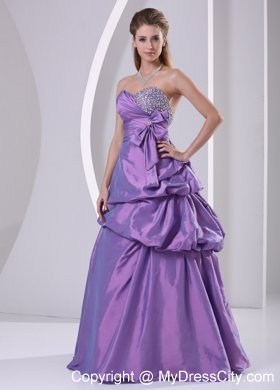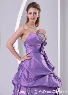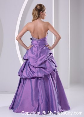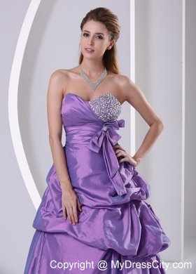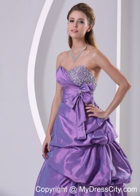 Sweet and romactic. The lovely purple gown features a sweet heart neckline with halfly beaed bust and asymmetrical ruching gather to a large bow on the waist. The mid-section is adorned with bubble pick ups that adds more interests. A zipper up back makes the dress for easy off and on.