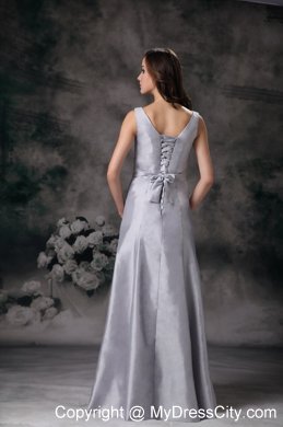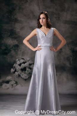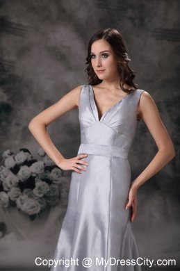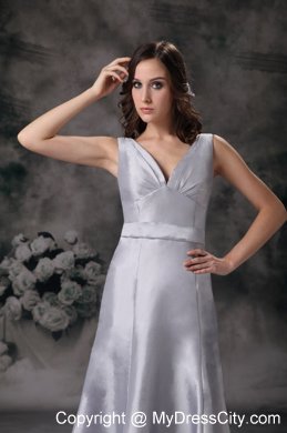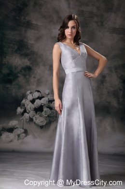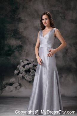 Simple yet elegant. This grey bridesmaid dress features a plunging v-neckline with two wide shoulder straps. The bodice is adorned with a ruched bust and a chic banded waist which shapes to a bow in the back. While the full length skirt flows freely to the floor and finishes with a lace up tie back.