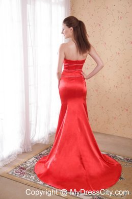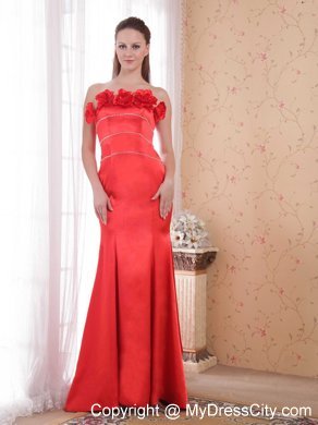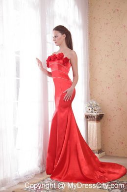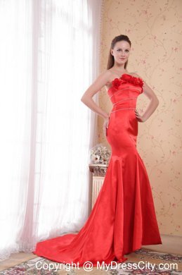 Fabulous evening gown. It features a straight neckline adorned with romantic flowers. The bodice consists of three rows of shimmering embellishments. A mermaid style with a long train creats a flattering shape.