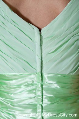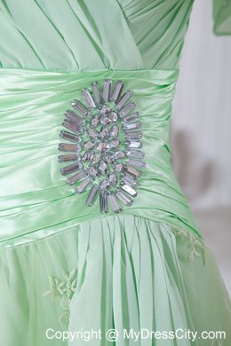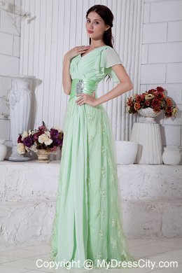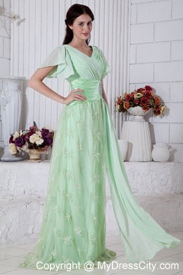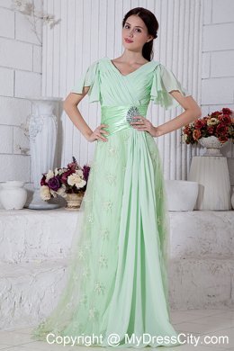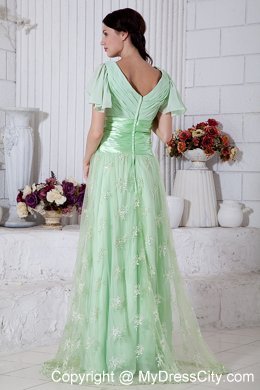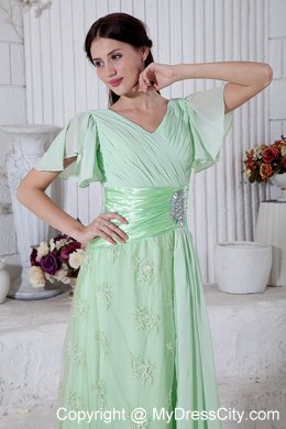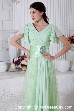 Butterfly sleeves are a design element that you don't often see on formal gowns, but the effect they create can be quite stunning, as this beautiful dress clearly shows. It has a lovely V neck with ruched fabric on the bust and flattering butterfly sleeves. The dainty waistband is accented with pretty rhinestones that create a elegant effect with the ruched fabric. The floor-length skirt has beautiful pleats and folds covered by a lace layer that creates lots of beauty throughout. A flattering and high class design�perfect for those extra special occasions.