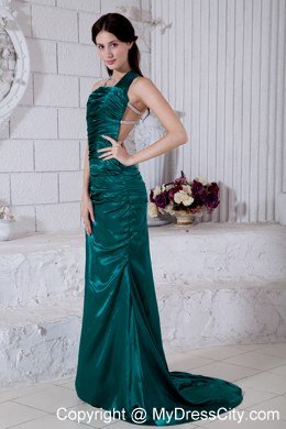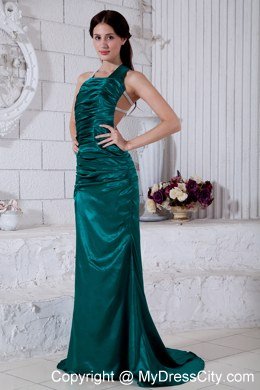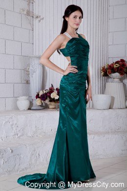 Ruching is lovely on its own, but when combined with other design elements and embellishments, the result is quite stunning � as this dress clearly shows. It is features a halter-style bodice and the straps crisscross on the exposed back in contrasting colors and fabric, one of which is fully embellished with little beadings. The floor-length skirt hugs your hips and flares out slightly from the knees in a pleated mermaid style, leaving a sweeping train in the back. Just beautiful!