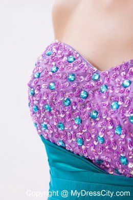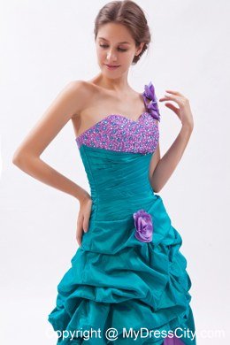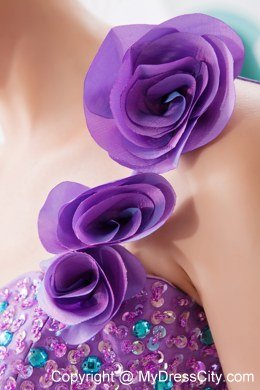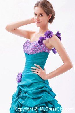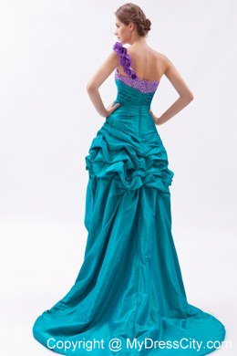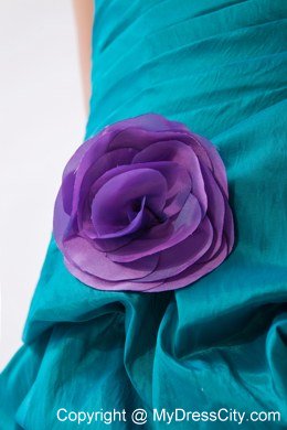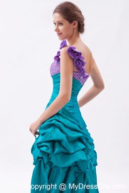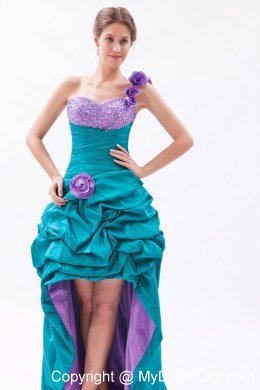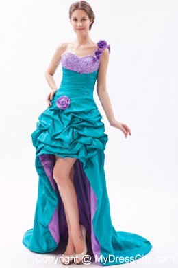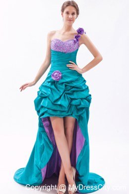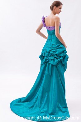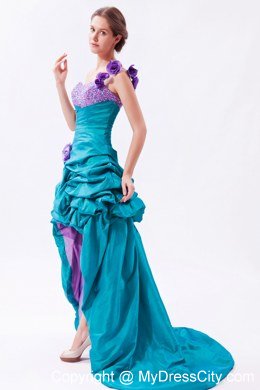 Show off your own fashion style in this unique formal dress for homecoming or prom! This one-shoulder strap high-low dress features an amazing combination of teal and purple fabric with sparkling accents on the bust. Pleated bodice and bubble skirt with handmade flower makes this style a feast for the eyes. A gorgeous train at the back creates a sense of luxury. A zipper up back completes the look.
