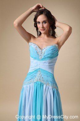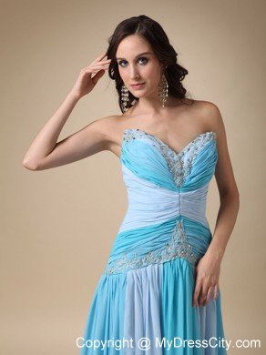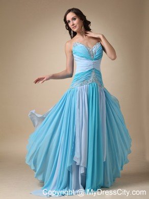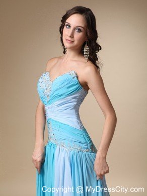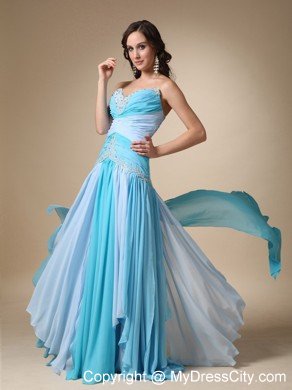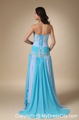 Do you want to experience the feeling of being the spotlight? This blue prom dress will make your dream come ture. It features a sweetheart neckline, exquisite ruchings and embellished beadwork, which defines your natural waistline. The floor-length skirt in contrasting blue shades flows freely to create a beautiful sweep train in the back. A stunning lace up back complestes this gorgeous design.