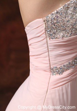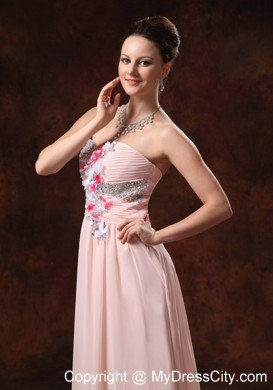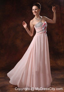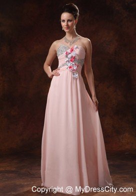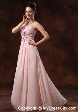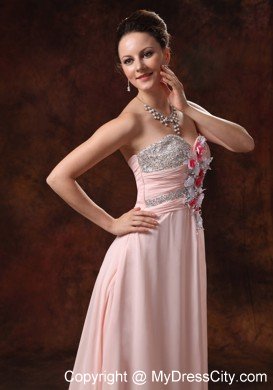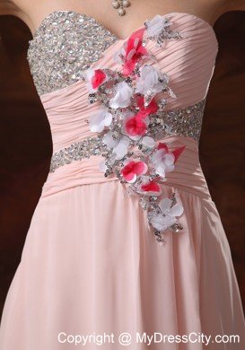 This beautiful sheath-style baby pink prom dress is made from chiffon and features a lovely floral applique on the pleated bust, a sweetheart neckline, pretty and exquisite beadings decorate the fitted bodice. The floor-length skirt falls in soft clean lines to the floor elegantly, which adds to its fullness and beauty.