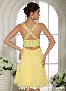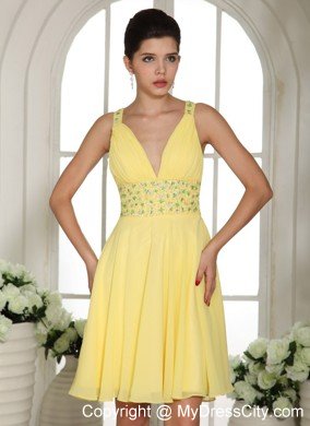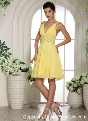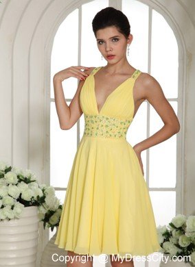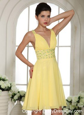 Do you want to experience the feeling of being the spotlight? This yellow prom dress will make your dream come ture.It features two wide straps bodice with a sexy deep V-neckline and lovely ruches throughout.The wasistband with crystals and sequins in the middle contours your curve. The layered short skirt and the open back adds the charm.A stunning dress you can't miss.