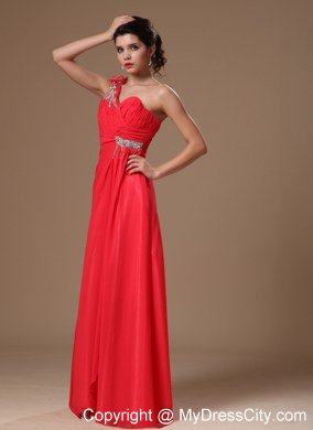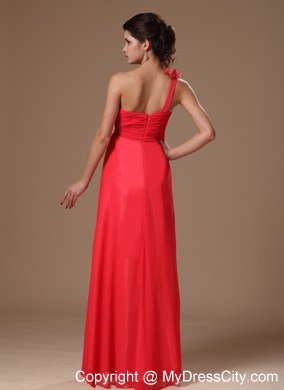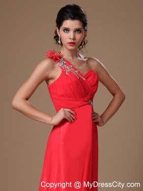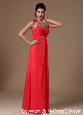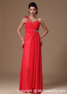 An asymmetrical neckline and delicate ruching on the bust create a figure flattering style for your prom or formal. This long dress in coral red features hand flower and beadings on the top shoulder and sparkling accents at the empire waist where the floor length skirt is gently gathered before flowing beautifully to floor. This one shoulder prom dress is completed with a hidder zipper back.