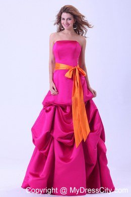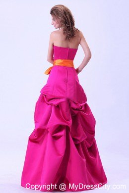 This is a lovely dress and would make beautiful addition to anyone's formal wardrobe! This strapless hot pink dress is highlighted by the contrasting orange colored sash and bow, creating a wonderful view for the fabulous dress. Feminine pick ups skirt is the perfect touch. Zipper up design makes it easy to put on and off. Come and make your day special and rememberable with this special gown!
