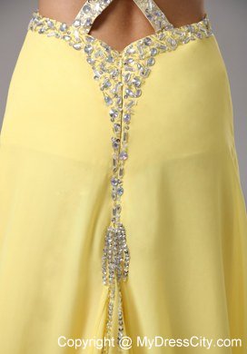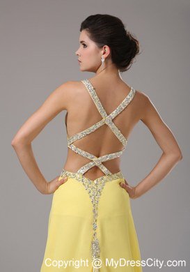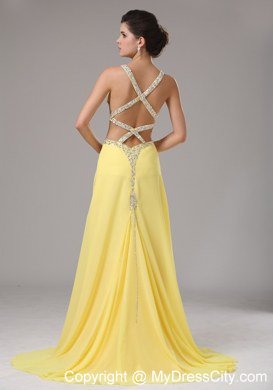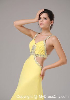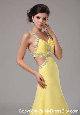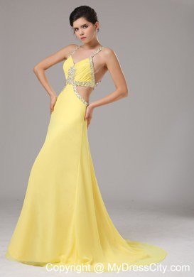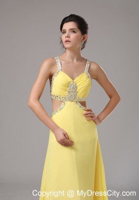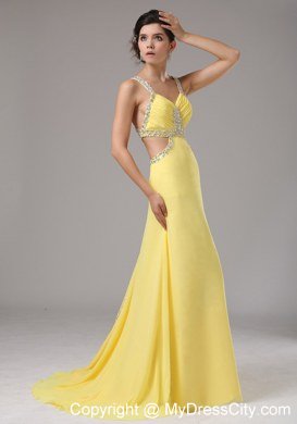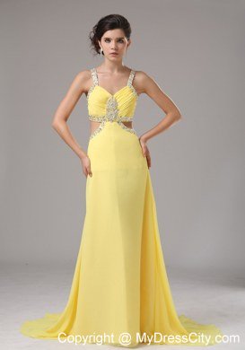 It truly is an example of high end couture fashion. It features a modest sweetheart neckline with two straps with shining beading for decoration in glamous light chiffon fabric. Coordinating hollow on both side of waist to the mid-section of the bodice adds interest. A pretty A-line shape skirt has a brush train without being trouble by it when you move. The open back is supported by twisted strap making you sexy. If you're looking for a high-end dress without the high-end price tag, this is definitely one you should consider.