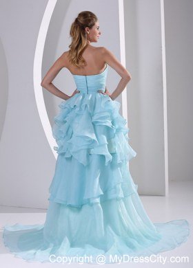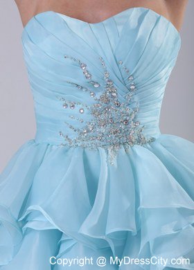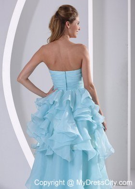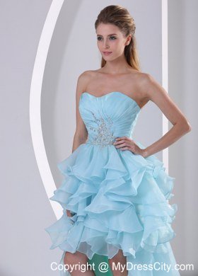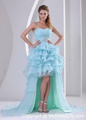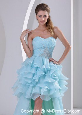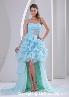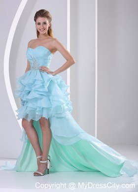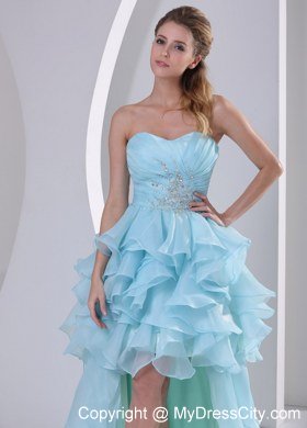 So sassy and wonderful dress this is that you will surely become the spotlight in the prom! This strapless sweetheart bodice is accented with some scattered shimmering beadings and the chic ruching. The high-low skirt is made from comfortable layers of tulle ruffles that make the dress full and a soft sweep attarcts all the attention of the public. The zipper up closure completes this design. Seize this opportunity, otherwise you will be regretful!