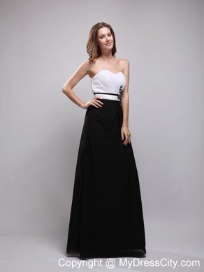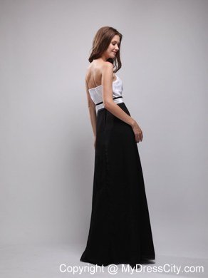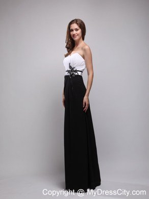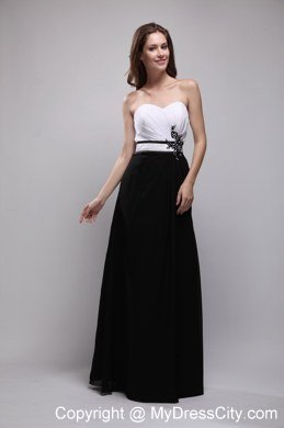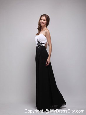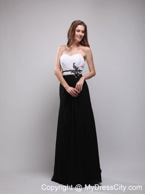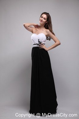 A sweetheart prom dress with a ruched bodice a slim band with appliques encrusted with beading on the side.A white bodice with a black with skirt is such an excellent matching on this dress. The tulled skirt give you a feeling of floating. Stepped on the floor,it will look as if you are floating in the air. The dress is simple, yet pretty.