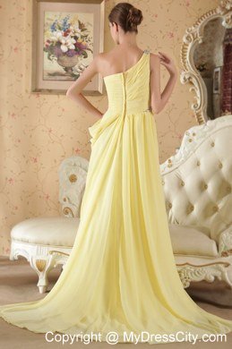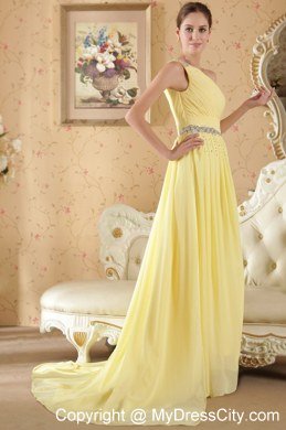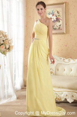Simply designed dresses can make a dramatic first impression � like this one. It features a beaded one shoulder top bodice with a lovely pleated texture. An asymmetrical neckline create a conservatively sexy. It is gathered by the ruched waist which adds interest to the midsection.The floor-length skirt is made from soft layers of fabric and moves beautifully with you when you move. Simple, yet simply charming.