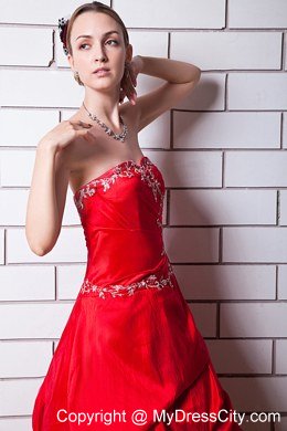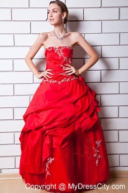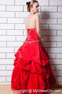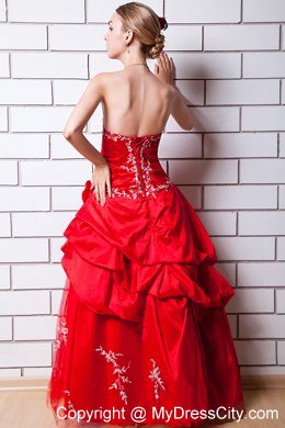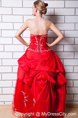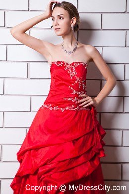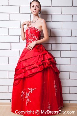 It's quite inspiring in such a hot color dress. Chic strapless bodice is highlighted with a loophole on the embroidered trimming of the neckline. Gathered handflower on leftside of waist creates a close-fitting bodice. The floor length skirt is scattered with appliques and layers giving this gown an enchanting style you're sure to love. The lace up closure finishes this fabulous look.