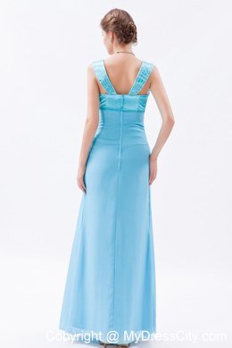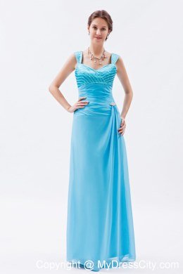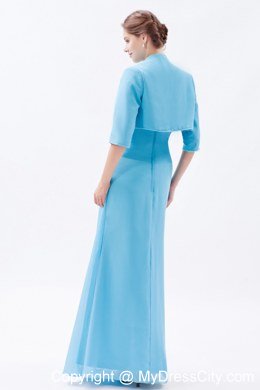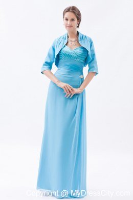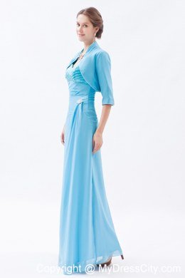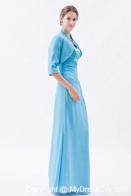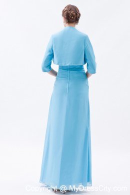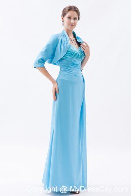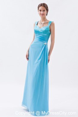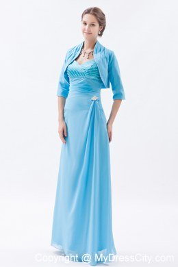 Twirl and whirl your way to an unforgettable evening in this festive, glamorous blue prom dress! The fitted bodice with two wide straps is completely coated in fine, shimmering, gorgeous rhinestones and the empire waist is defined by a chic brooch in the leftside. The soft floor length skirt shows off the beauty of your long legs. The matching jacket adds more elegance and retouch, and a hidden zipper up completes the look.