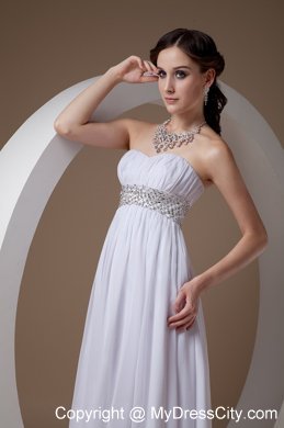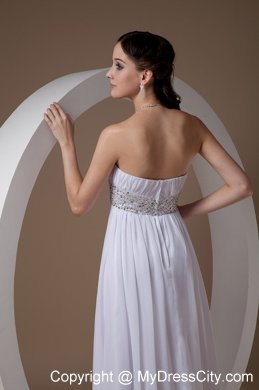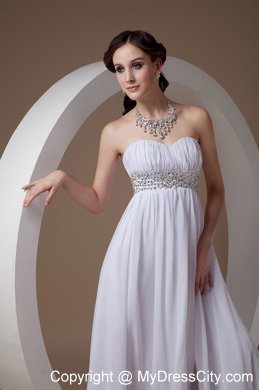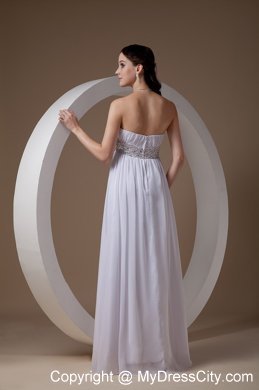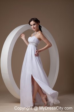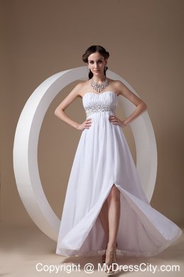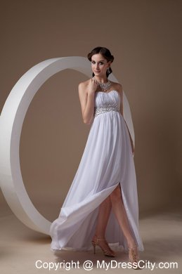 Simply designed dresses can make a dramatic first impression, just like this one. It features a strapless sweetheart style bodice with a lovely pleated texture. An asymmetrical band adorns the midsection and features intricate beadwork throughout, which attracts countless of appreciated eyes. The floor-length white skirt has a slit in the front to outline your slim figure. Wearing this dress, you will sure to be the party queen.