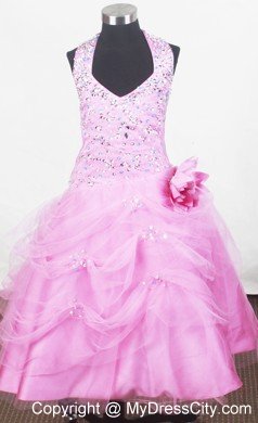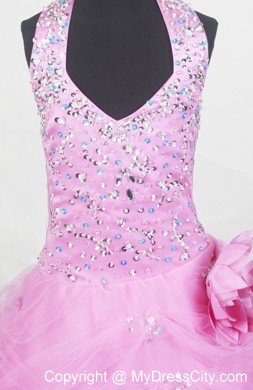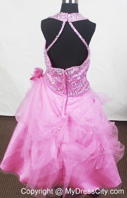 This lovely pinky beautiful pageant dress has a unique flare that makes it a great choice for a national or local level pageant. Halter-top neck accentated with crystals and colorful beading encrusted bodice, completes with tulle pick-ups on the full skirt. The floral decorations on the waist flattering the whole dress. The back is fitted with a zipper.