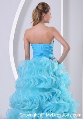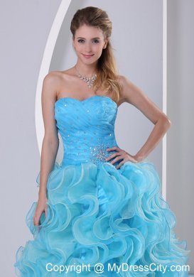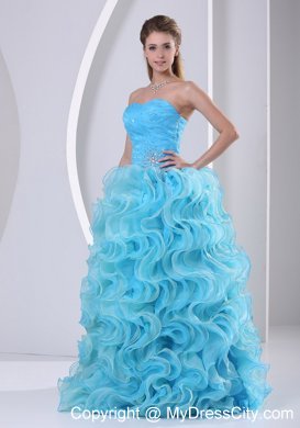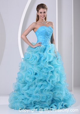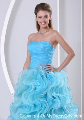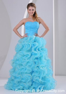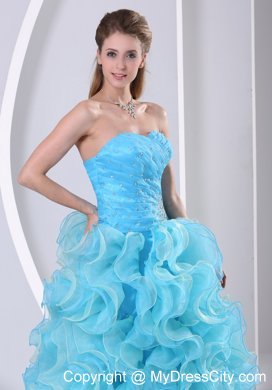 This quinceanera dress features a strapless bodice with sweetheart neckline full of dazzling beaded work. The beadings and ruchings embellished the bodice adds interest and detail to the mid-section of the dress. The floor-length skirt which features a long and winding series of ruffles with contrasting colors swirling together in luxurious tulle all the way to the floor in a pretty A-line shape creates drama.