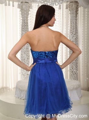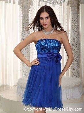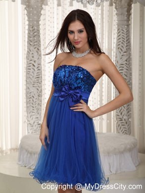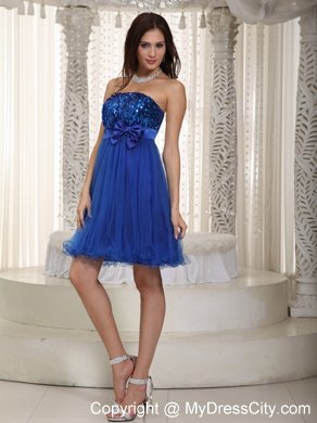 This blue gown features strapless bodice that is encrusted with sequince on the front and the back and a lovely bow on the waist. Soft chiffon creates an interesting handkerchief hem. The skites features pleats. A bit retro and a lot gorgeous! You will look like a queen in the pretty dress.