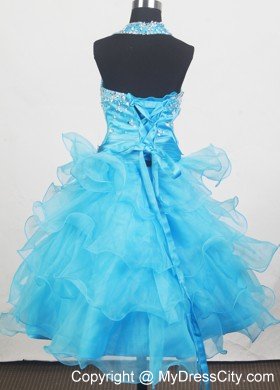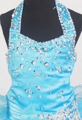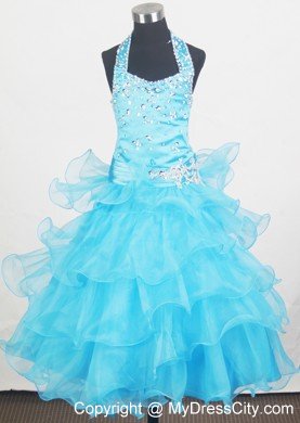 This fairytale-like gown will make your little one feel like the belle of the ball. Glittering straps and the halter-top neckline have been encrusted in dazzling crystals. Pleats and appliques at the waistline makes for a splendid lead in to the gowns phenomenal skirt. Tiered layers on the full skirt completes the look. The corset style bodice is finished with a lace up tie back.