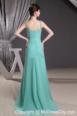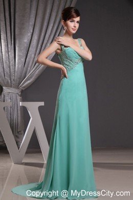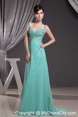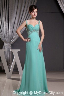 A-line style dresses are very popular figure flattering designs. This one wraps your body in gorgeous chiffon material. It has two straps adorns beautiful beadwork with sweetheart neckline design that features gorgeous ruches. The floor-length skirt with brush train is turquoise and the dress moves beautifully with you when you walk.