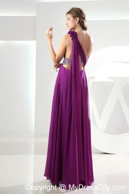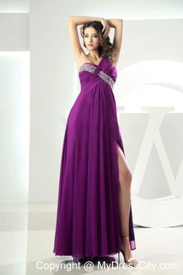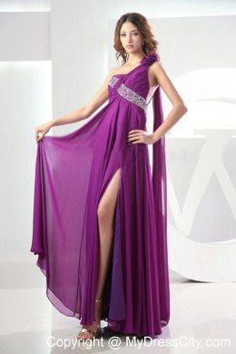 This sleek one shoulder evening gown is unmistakably chic with classic styling and sparkling beaded accents. The purple stunning dress features one floral strap and beaded bodice. A seductive side slit lets you glide across the dance floor with ease. A watteau train adds beauty and grace to the dress. The gorgeous dress is just designed for you.