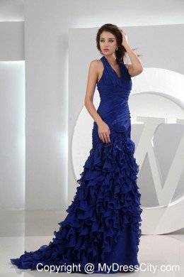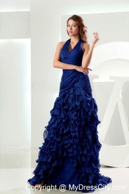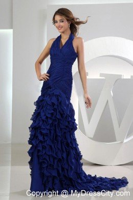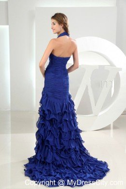 Get a celebrity look for less with this stunning halter top royal blue prom dress. This mermaid style dress has a ruched bodice and a ruffled layers skirt. A brush train and sexy back add beauty and grace to the dress. A hidden zipper makes for easy off and on and secures the dress in place.