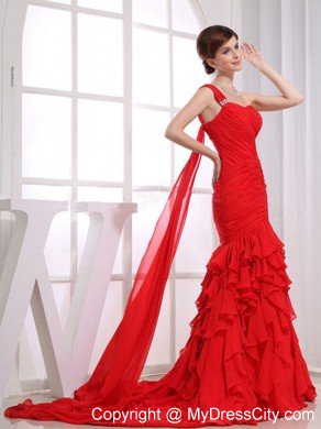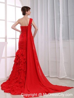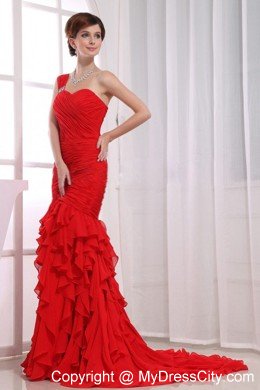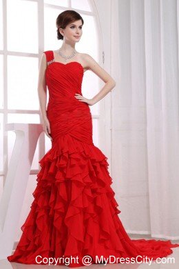This prom gown will be perfect for any gathering! This design has one shoulder neckline with regular ruchings stretch from the bodice to the mermaid starts. Ruffles all over the skirt will make you a princess on the party. A watteau train on the back airs a flowy aesthesis.The zipper up back finishes the look. It's a regal look that is sure to make everyone remember your entrance.