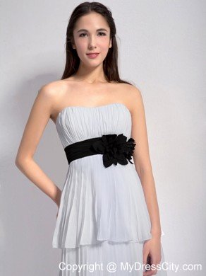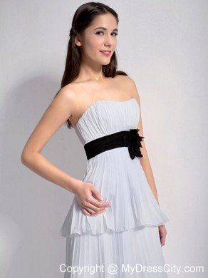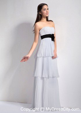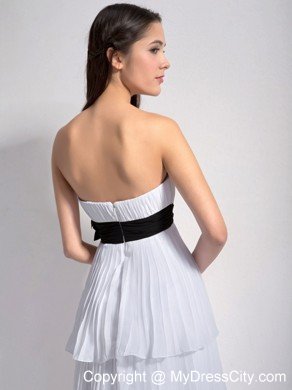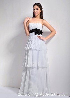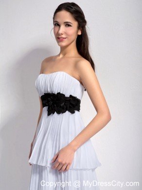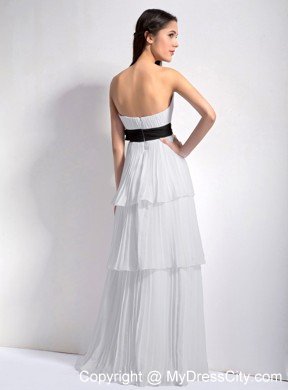 Pleated, airy material makes this dress a feast for the eyes. This dress features a modest strapless sweetheart neckline and the black waistsash accented with enchanting flowers, which add interest and detail to the mid-section of the dress. Multi-tiered chiffon skirt flows naturally, it moves graciously with you when you walk, gently sweeping the floor. A half open with zipper up back completes the whole look, both sexy and elegant. The most important merit of the dress is that the equisite design brings magical confidence.