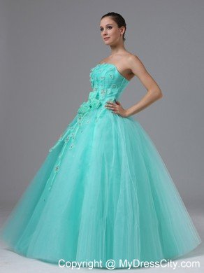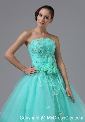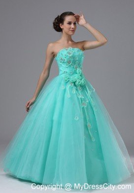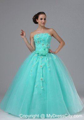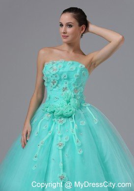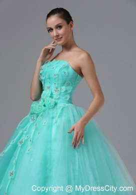 When it comes to lavish allure, you can't do better than this strapless quinceanera ball gown! It features a fitted bodice with adorable small flower embellishments.The floor-length skirt which is decorated by a bunch of hand made flowers is a long and net fabric overlay making the dress in a pretty A-line shaped. If you're looking for a high-end dress without the high-end price tag, this is definitely one you should consider.