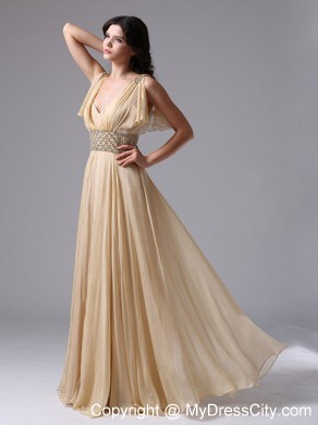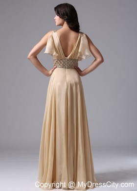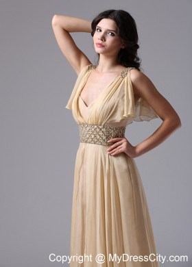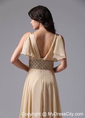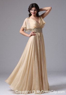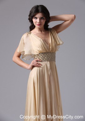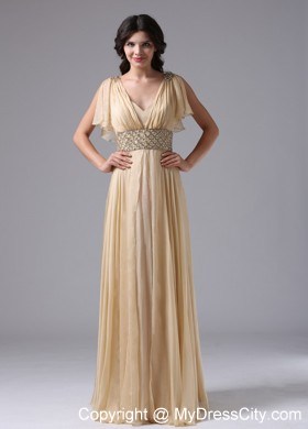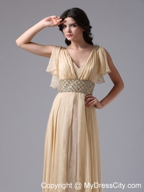 Beauty and comfort combine to create this elegent dress. It features V-neck with butterfly sleeves, the ruched bodice is accented with wide beading waistband. The skirt falls in soft, clean lines to your feet where it pools in luscious puddles of fabric. The back of the dress has a hidden zip closure, which makes for easy off and on and completes the design.