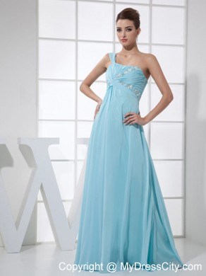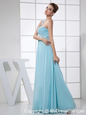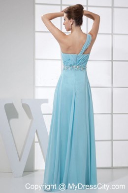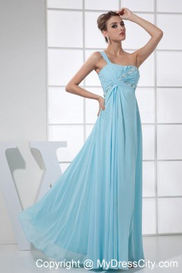 This elegant light blue prom dress features a unique one shoulder neckline. The empire style camouflages a pear shape or thick waist and creates an illusion of height for short or petite figures. The flowy silhouette sways beautifully when you're moving. An elegant empire skirt with beadings and ruchings give you a fantastic look. Wearing the dress, you are sure to be the center of the party!