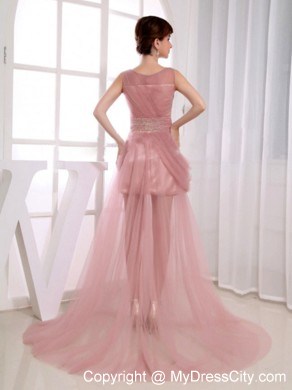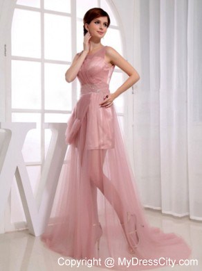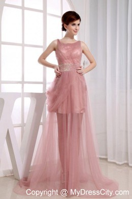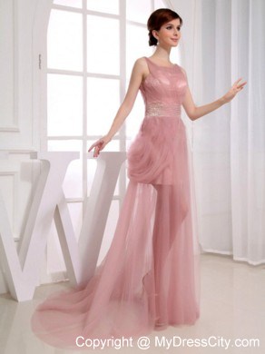 Elegant and Gorgeous! This pink prom dress with zipper is characterized by a modest scoop neckline with straps bodice, which can accentuate your feminine quality. The mini-skirt shows off your perfect legs, overlayed a flowing tulle court train cascading to the floor, which makes you look like a pricess. What a perfect dress!