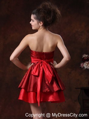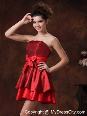 This red dress is simply gorgeous! This mini-length strapless taffeta bridesmaid dress is featured by a bowknot in front. The fitted bodice modifites your charming figure. It's a perfect choice for homecoming and any formal attendance. The layeres skirt falls inslean line to knee and sways beautifully when you move. And you will be the shinning star when you go out in it. Silhouette: A-Line