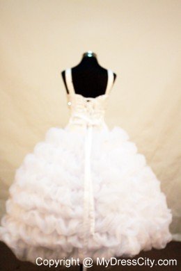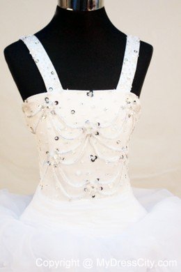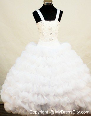 This beautiful White pageant dress features a straight neckline on an A-line silhouette accented with an embellished bust, and tiered skirt with multi layers of soft tulle with a ruffled hem.